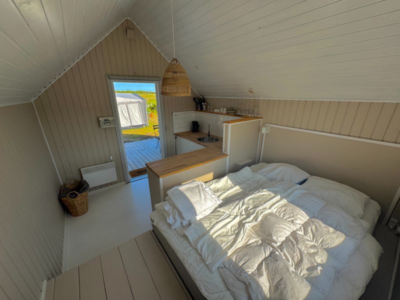 Inrichting: 2 slaapplaatsen in een 2-persoonsbed (140x200 cm), koelkast, French press koffiekan, waterkoker en wastafel. Er zijn dekbedden en kussens voor 2 personen, bedlinnen breng je zelf mee of kan je bij de receptie huren. Geniet van het mooie duinenlandschap van op het terras dat voor het huisje ligt. Dit is ingericht met een tafel en stoelen. Als je eten wilt bereiden, kun je gebruikmaken van onze gemeenschappelijke keuken op de camping. Aan de receptie kan je een diepvriezer uitlenen. De wifi is gratis.