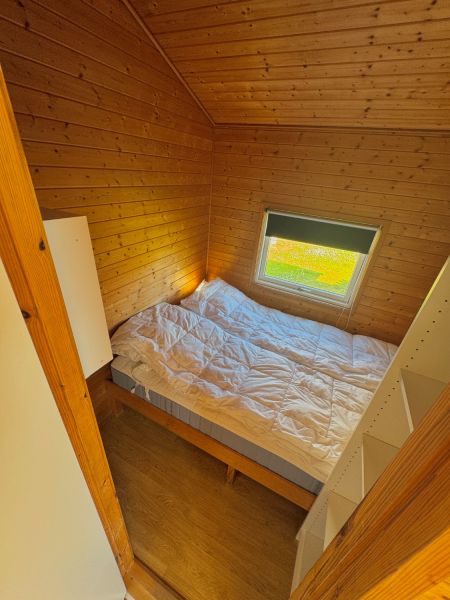 Inrichting: Het huisje is 25 vierkante meter groot en is ingericht met een slaapkamer, een mezzanine, een badkamer met douche/toilet en een leefruimte. De slaapplaatsen vind je in een 2-persoonsbed in de slaapkamer, een slaapbank in de leefruimte en 2 eenvoudige extra bedden op de mezzanine. Er zijn dekbedden en kussens voor 5 personen, bedlinnen breng je zelf mee of kan je bij de receptie huren of reserveren bij de boeking. In de leefruimte is een eethoek met tv, evenals een keuken met fornuis, oven, koelkast met vriezer, koffiezetapparaat en een waterkoker. De keuken is uitgerust met bestek en servies voor 5 personen en keukengerei. Voor het huisje ligt een overdekt terras met tafel en stoelen. De wifi is gratis.